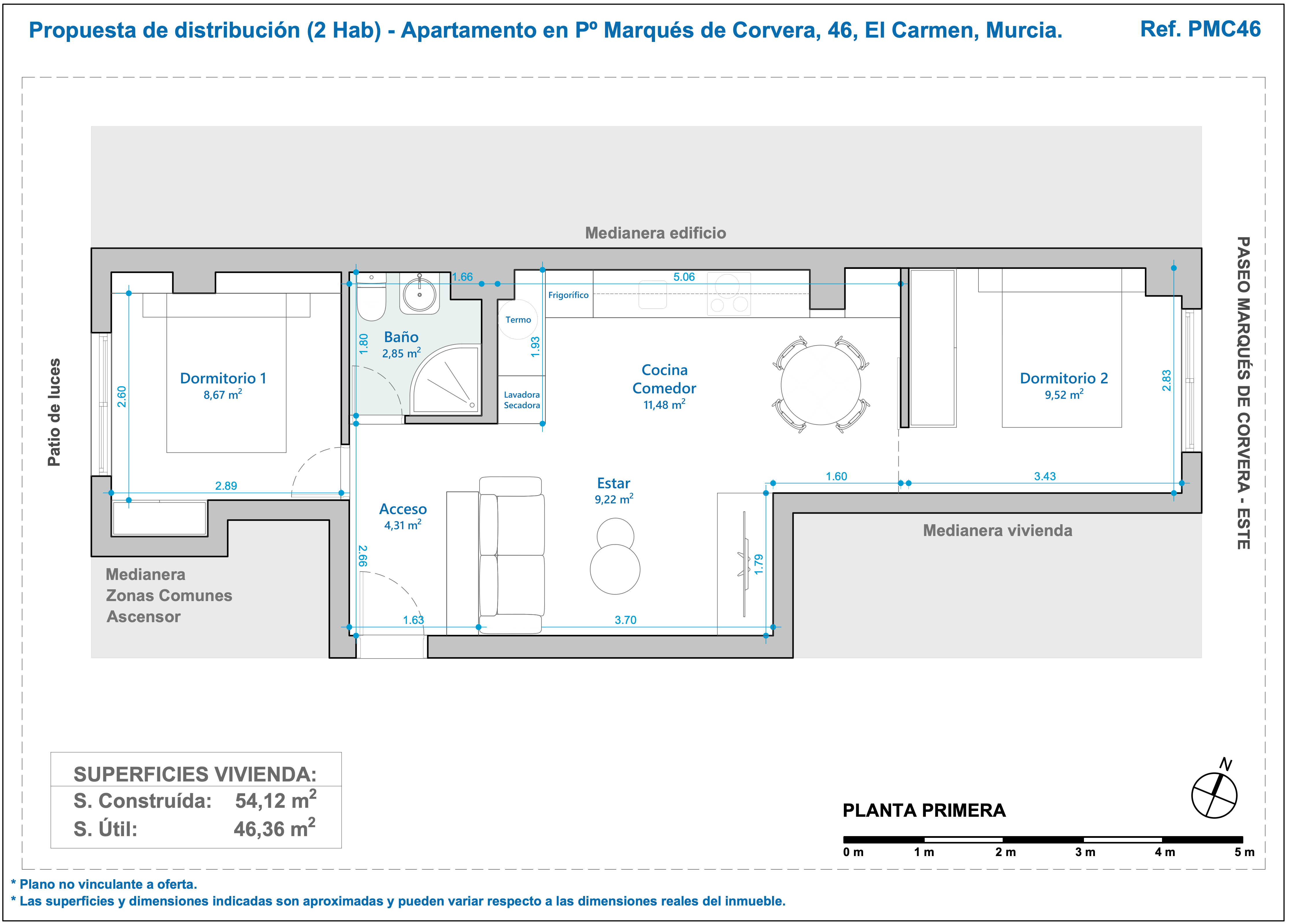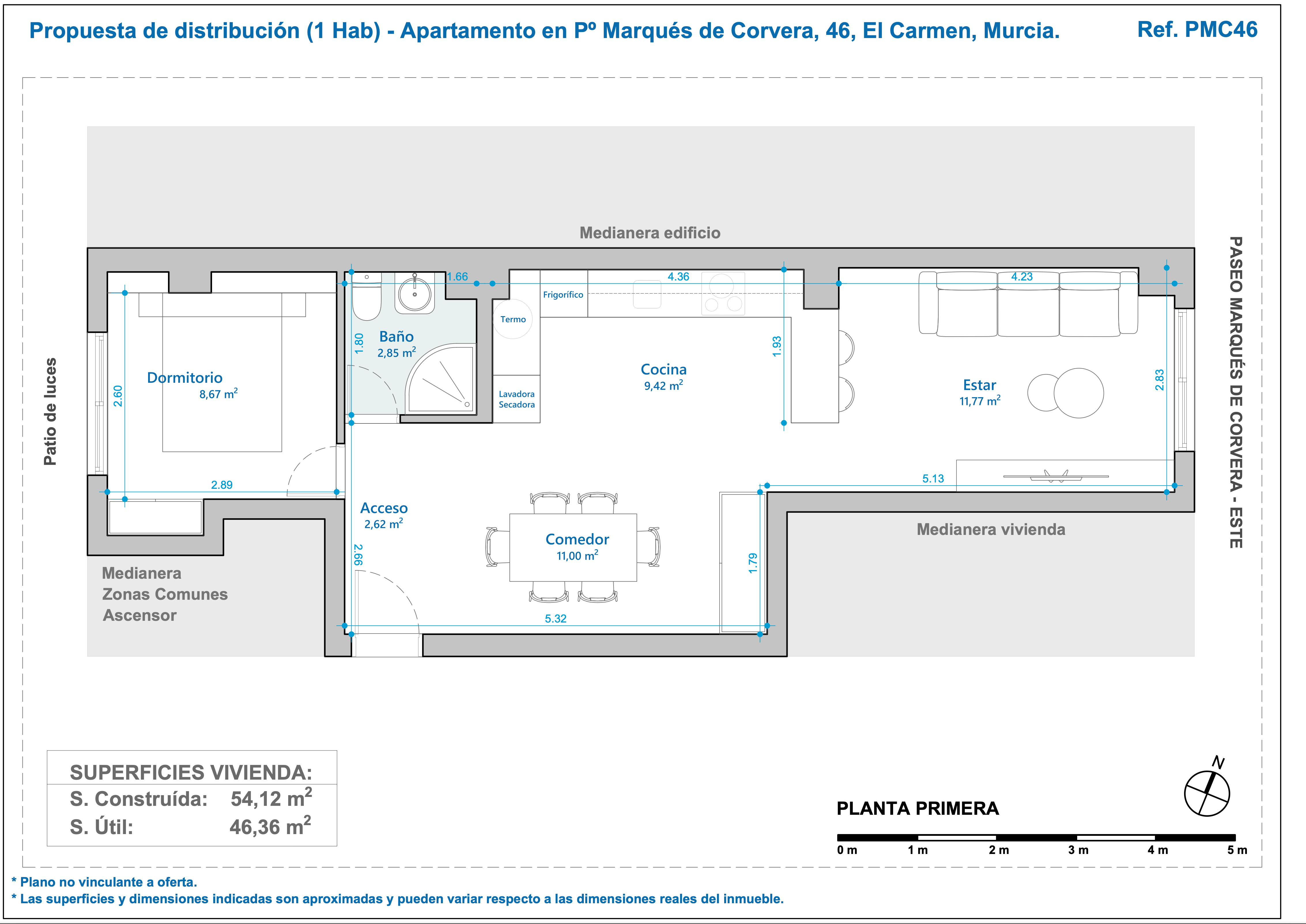 La vivienda, situada en una primera planta con ascensor, cuenta con 63 m² construidos, distribuidos en salón-comedor luminoso con orientación este, cocina, amplio dormitorio y baño espacioso.